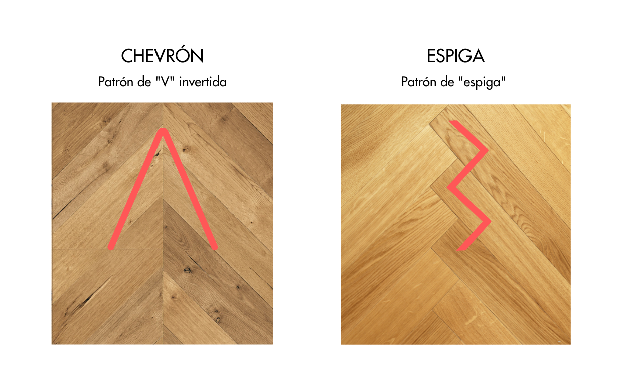 La principal diferencia entre los suelos de parquet en chevrón y en espiga radica en la forma en que vienen cortadas las lamas y consecuentemente a su manera de instalar las tablas. En el parquet en chevrón, las tablas se cortan en ángulo de 45 o 60º creando unas lamas a forma de romboide y se colocan en un patrón de «V» invertida, creando una línea recta en el centro del diseño. Por otro lado, en el parquet en espiga, las tablas se cortan en ángulo recto de 90º, cada lama será entonces un rectángulo, y se unen en un patrón de «espiga» o «HERRINGBONE», generando un diseño más continuo y en zigzag.