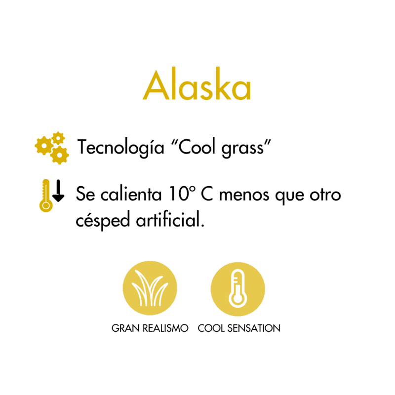 Gracias a su exclusivo hilo técnico de última generación, DGREEN Alaska incorpora la tecnología “Cool Grass”, capaz de reducir la temperatura superficial hasta 10°C menos que los modelos convencionales. Esta prestación lo convierte en una opción especialmente indicada para jardines, terrazas, áticos o espacios exteriores en regiones cálidas o con alta exposición solar y altas temperaturas.