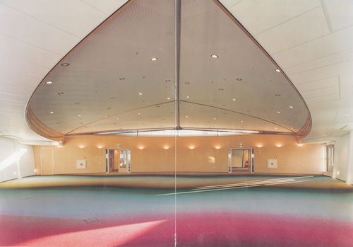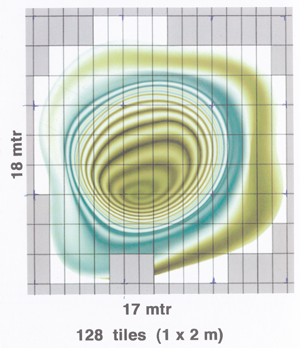 El objetivo del cliente en este hall era representar un torbellino gigantesco, para ello se presentó un diseño de 17 x 18 mtrs formado por losetas de 1 x 3 mtrs. Un total de 128 losetas diferentes sin junta visible entre ellas.